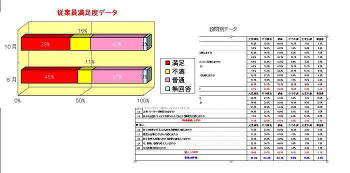 <主な流れ> 1.調査票設計 ・・・ アンケート開始時期の確定、アンケート内容の確定 ▼ 2.ESアンケートの回答システムの構築 ・・・ 郵送、FAX、メール ▼ 3.アンケートの開始 ・・・ 約1ヶ月を目標に開始 ▼ 4.集計・分析・検証 ・・・ 満足度、不満足度をカテゴリー毎に定量化 ▼ 5.レポート(報告書)の作成 ▼ 6.レポート(報告書)の納品 ・・・ 経営陣面談 ▼ 7.検証・課題の抽出・改善計画の立案 ▼ 8.人事考課制度等の構築